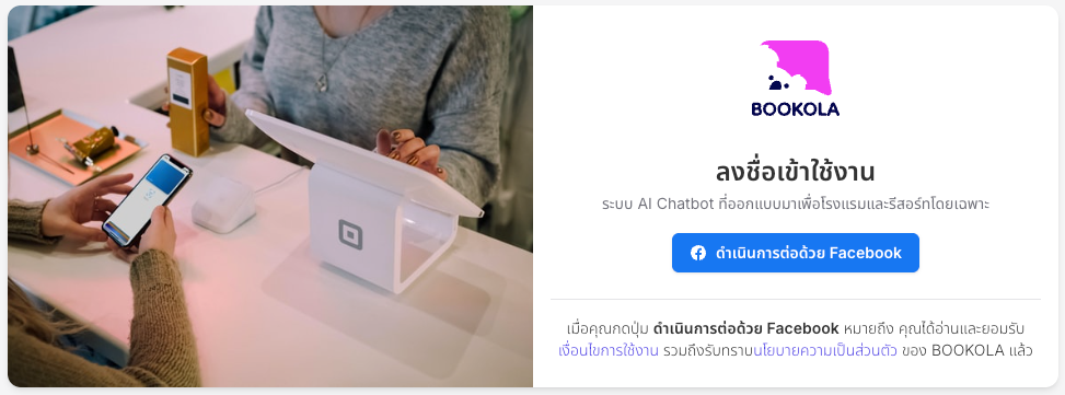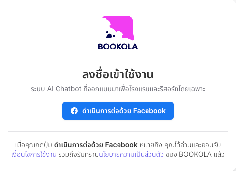 ก่อนที่จะกด “ดำเนินการต่อด้วย Facebook” ให้ผู้ใช้งานกด “เงื่อนไขการใช้งาน” และ "นโยบายความเป็นส่วนตัว" เพื่ออ่านเงื่อนไขและการเข้าถึงข้อมูลที่ BOOKOLA ได้กำหนดไว้