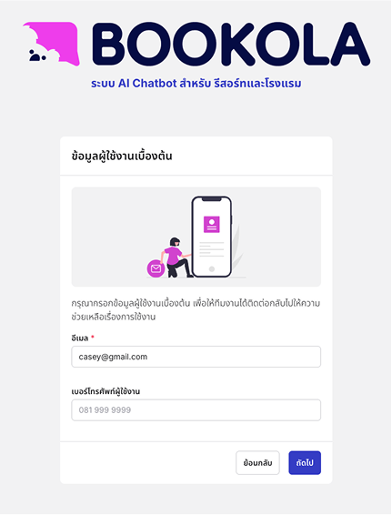 ขั้นตอนนี้ ระบบ BOOKOLA จะขอข้อมูลติดต่อเบื้องต้นของผู้ใช้งาน