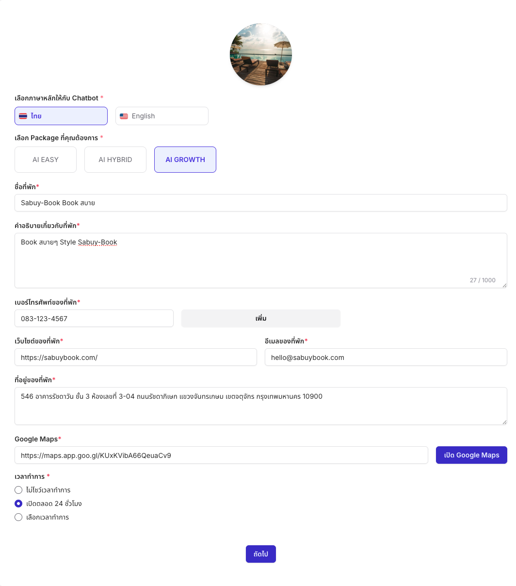 - ที่อยู่ของที่พัก - ที่อยู่ที่ผู้ใช้งานกรอกจะถูกนำไปตอบให้กับลูกค้าในแชทเมื่อลูกค้าถามถึงโลเคชั่นของที่พัก