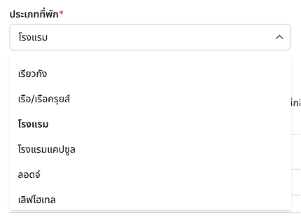 ประเภทที่พัก - กดที่ลูกศรชี้ลงในกล่องเพื่อเลือก “ประเภทที่พัก” ของผู้ใช้งาน
