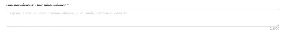 รายละเอียดเพิ่มเติมเกี่ยวกับการเช็กอิน-เช็กเอาท์ - ระบุรายละเอียดเพิ่มเติมเกี่ยวกับการเช็กอิน-เช็กเอาท์ เช่น